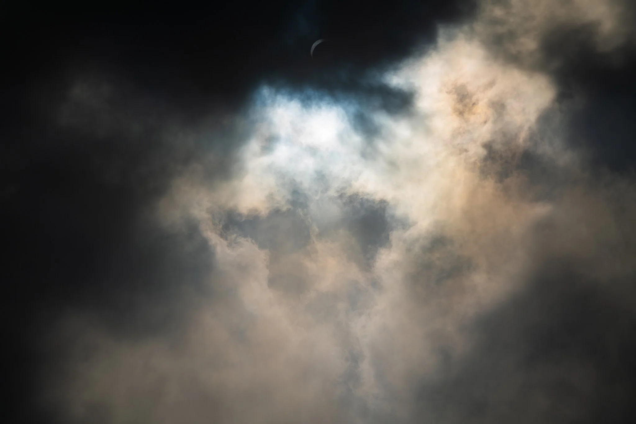As we were watching the clouds move above us, we caught a couple glimpses of the partial eclipse through the clouds that only lasted about few seconds at a time. Since I had a narrow field of view with my telephoto lens, it was quite challenging to point my camera at where I thought the sun was behind the clouds and then try to quickly reframe my photo when the sun would peek out. I opted for a wider field of view so that it would be easier to frame my photo, and I do quite like the extra context of the clouds that the wider field of view provides. Also, there were still so many clouds that there was no need to use a solar filter.